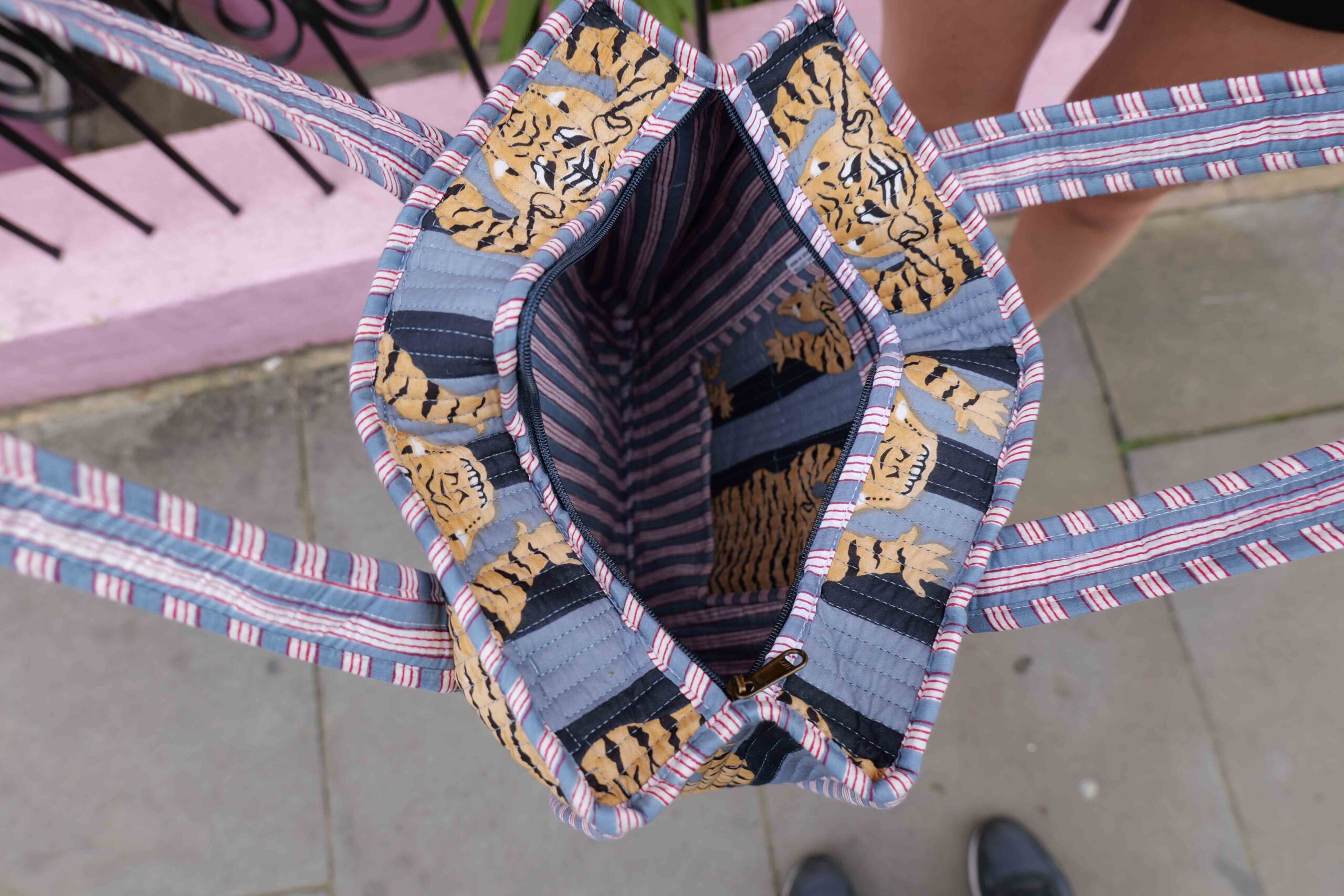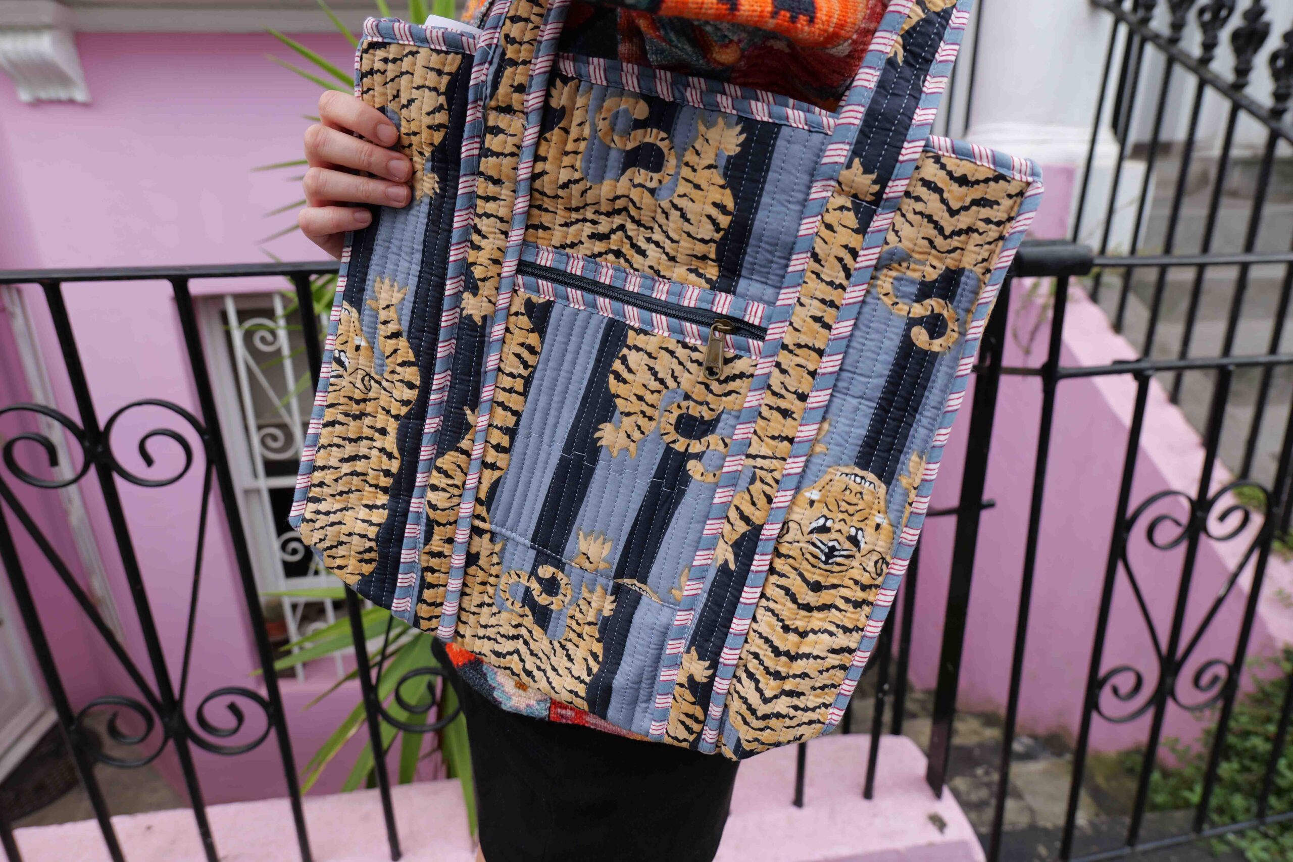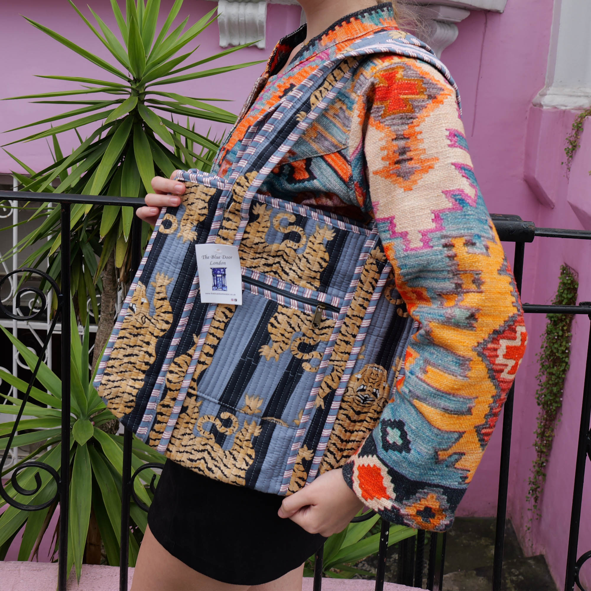 The Blue Door -Grey Tiger Fashion Bag-Full Handmade – 100% Cotton Outfit Design for outing, outdoor, summer and winter All Seasons